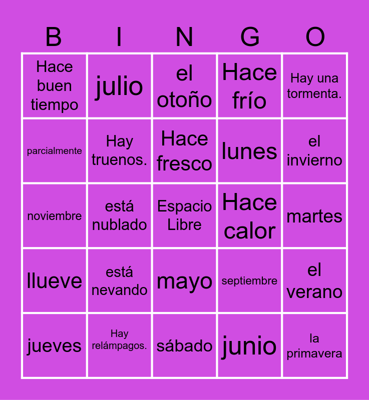 This bingo card has a free space and 38 words: está lloviendo, Hace sol, Hace mal tiempo, Hay truenos., el verano, está nevando, Hace fresco, Hace viento, Hay una tormenta., lunes, está nublado, Hace frío, la primavera, martes, parcialmente, llueve, Nieva, el otoño, miércoles, Hace calor, Hace buen tiempo, Hay relámpagos., el invierno, jueves, viernes, sábado, domingo, enero, febrero, marzo, abril, mayo, junio, julio, agosto, septiembre, noviembre and deciembre.