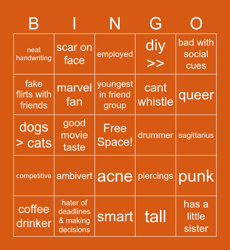 This bingo card has a free space and 24 words: ambivert, hater of deadlines & making decisions, youngest in friend group, coffee drinker, bad with social cues, neat handwriting, fake flirts with friends, scar on face, drummer, acne, cant whistle, dogs > cats, piercings, punk, marvel fan, tall, sagittarius, employed, queer, good movie taste, has a little sister, competitive, diy >> and smart.