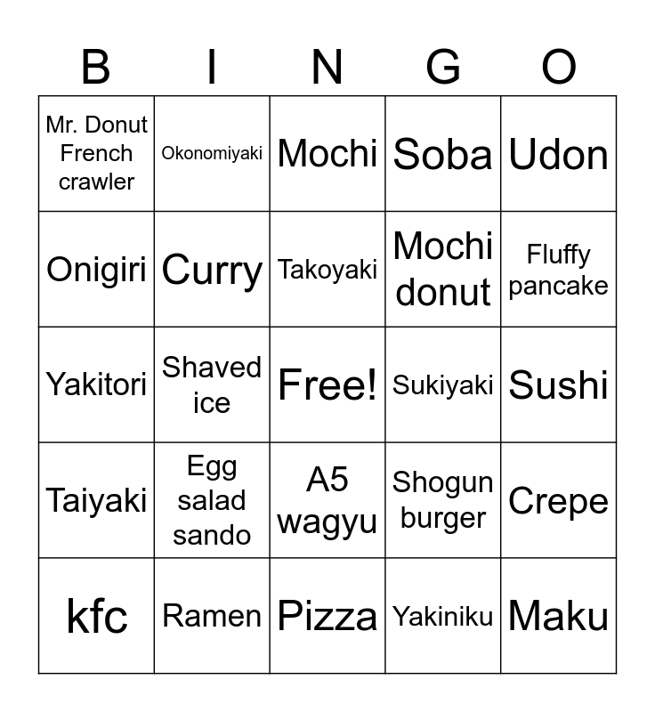 This bingo card has a free space and 24 words: Egg salad sando, Ramen, Takoyaki, kfc, Udon, Mr. Donut French crawler, Onigiri, Okonomiyaki, Sukiyaki, A5 wagyu, Mochi donut, Yakitori, Shogun burger, Crepe, Curry, Yakiniku, Sushi, Mochi, Fluffy pancake, Shaved ice, Maku, Taiyaki, Soba and Pizza.
