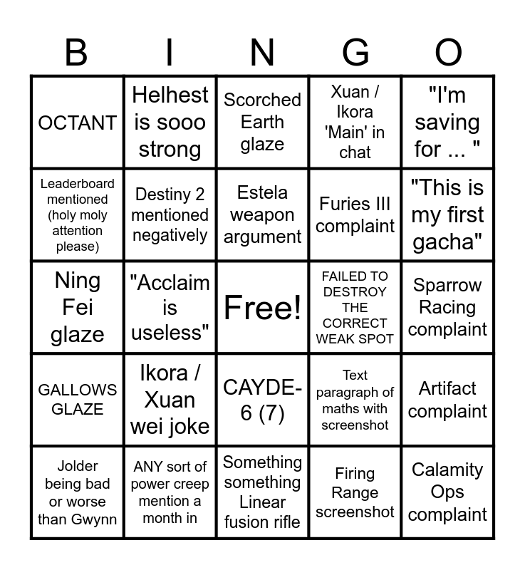 This bingo card has a free space and 24 words: Ikora / Xuan wei joke, ANY sort of power creep mention a month in, Estela weapon argument, Jolder being bad or worse than Gwynn, "I'm saving for ... ", OCTANT, Leaderboard mentioned (holy moly attention please), Helhest is sooo strong, FAILED TO DESTROY THE CORRECT WEAK SPOT, CAYDE-6 (7), Furies III complaint, Ning Fei glaze, Text paragraph of maths with screenshot, Artifact complaint, Destiny 2 mentioned negatively, Firing Range screenshot, Sparrow Racing complaint, Scorched Earth glaze, "This is my first gacha", "Acclaim is useless", Calamity Ops complaint, GALLOWS GLAZE, Xuan / Ikora 'Main' in chat and Something something Linear fusion rifle.