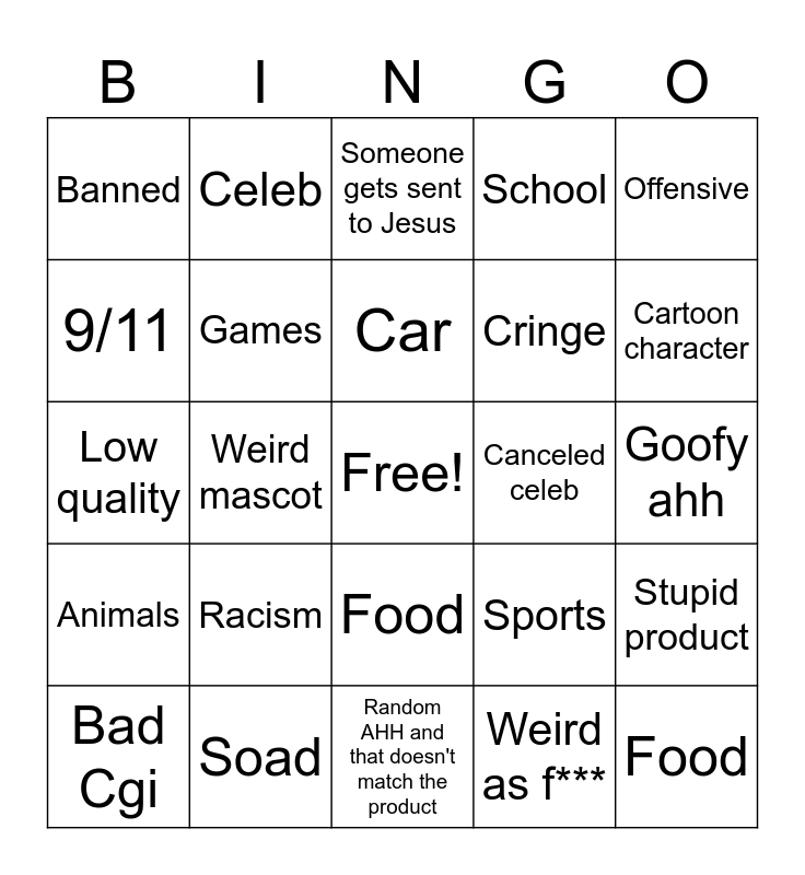 This bingo card has a free space and 24 words: Racism, Soad, Car, Bad Cgi, Offensive, Banned, 9/11, Celeb, Canceled celeb, Food, Cringe, Low quality, Sports, Stupid product, Games, Weird as f***, Goofy ahh, Someone gets sent to Jesus, Cartoon character, Weird mascot, Food, Animals, School and Random AHH and that doesn't match the product.