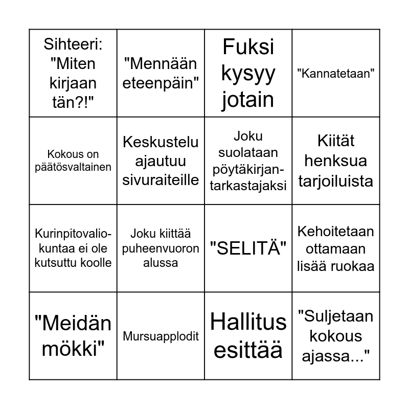 This bingo card has 16 words: Mursuapplodit, Kehoitetaan ottamaan lisää ruokaa, Fuksi kysyy jotain, Sihteeri: "Miten kirjaan tän?!", Kurinpitovalio-kuntaa ei ole kutsuttu koolle, "Mennään eteenpäin", "SELITÄ", Hallitus esittää, Kokous on päätösvaltainen, Keskustelu ajautuu sivuraiteille, "Meidän mökki", "Kannatetaan", Joku kiittää puheenvuoron alussa, Kiität henksua tarjoiluista, Joku suolataan pöytäkirjan-tarkastajaksi and "Suljetaan kokous ajassa...".