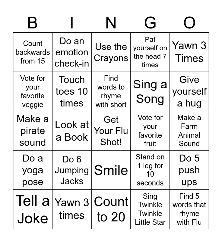 This bingo card has a free space and 27 words: Stand on 1 leg for 10 seconds, Make a Cat Sound, Sing a Song, Count to 20, Vote for your favorite veggie, Use the Crayons, Do an emotion check-in, Do a yoga pose, Vote for your favorite fruit, Do 5 push ups, Make a pirate sound, Pat yourself on the head 7 times, Tell a Joke, Yawn 3 times, Give yourself a hug, Smile, Touch toes 10 times, Find words to rhyme with short, Do 6 Jumping Jacks, Count backwards from 15, Make a Farm Animal Sound, Sing Twinkle Twinkle Little Star, Look at a Book, Find 5 words that rhyme with Flu, Smile, Yawn 3 Times and Take 3 Deep Breaths.