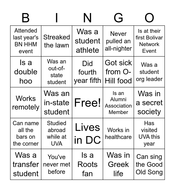 This bingo card has a free space and 24 words: Studied abroad while at UVA, You've never met before, Did fourth year fifth, Was a transfer student, Is at their first Bolivar Network Event, Attended last year's BN HHM event, Is a double hoo, Streaked the lawn, Is an Alumni Association Member, Lives in DC, Got sick from O-Hill food, Works remotely, Works in healthcare, Has visited UVA this year, Was an out-of-state student, Was in Greek life, Was in a secret society, Was a student athlete, Was a student org leader, Was an in-state student, Can sing the Good Old Song, Can name all the bars on the corner, Never pulled an all-nighter and Is a Roots fan.
