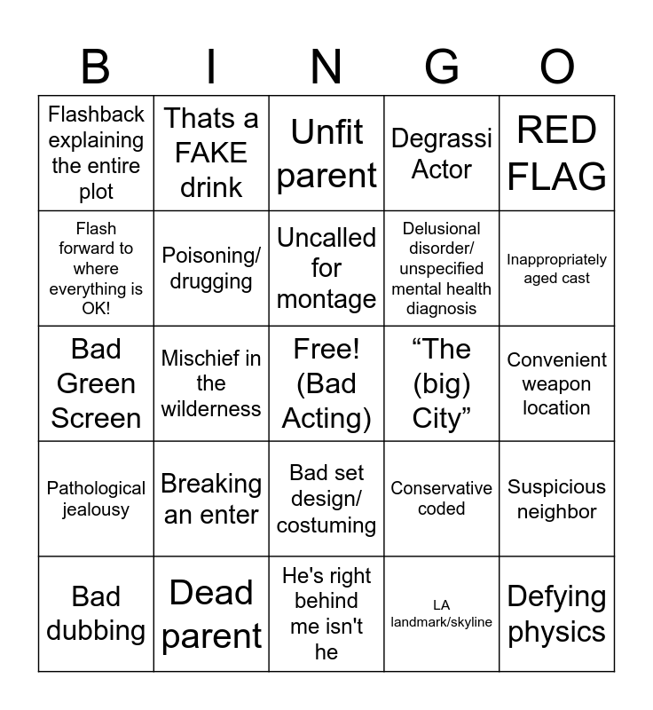 This bingo card has a free space and 32 words: LA landmark/skyline, Lifetime Universe Moment, Mischief in the wilderness, Mom Win, Pathological jealousy, Poisoning/ drugging, RED FLAG, Suspicious neighbor, Thats a FAKE drink, That's definitely a felony, Uncalled for montage, Unfit parent, Weird music choice, Women hating women, “The (big) City”, Bad computer visuals, Bad dubbing, Bad Green Screen, Bad set design/ costuming, Breaking an enter, Conservative coded, Convenient timing, Convenient weapon location, Dead parent, Defying physics, Degrassi Actor, Delusional disorder/ unspecified mental health diagnosis, Flash forward to where everything is OK!, Flashback explaining the entire plot, He's right behind me isn't he, Impossible dialogue and Inappropriately aged cast.