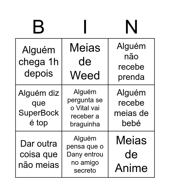 This bingo card has a free space and 8 words: Alguém recebe meias de bebé, Alguém não recebe prenda, Meias de Weed, Dar outra coisa que não meias, Alguém chega 1h depois, Meias de Anime, Alguém diz que SuperBock é top and Alguém pensa que o Dany entrou no amigo secreto.