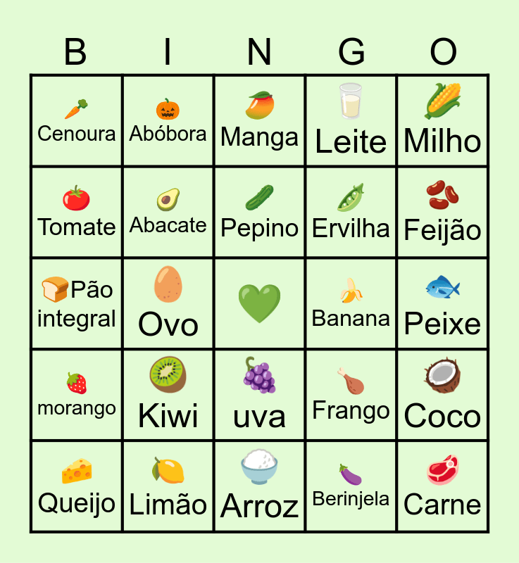 This bingo card has a free space and 37 words: 🍎 Maçã, 🍐 Pera, 🥦 Brócolis, 🥑 Abacate, 🥥 Coco, 🥝 Kiwi, 🥒 Pepino, 🫑Pimentão, 🌽 Milho, 🍠 Batata Doce, 🥚 Ovo, 🥛 Leite, 🥩 Carne, 🐟 Peixe, 🍅 Tomate, 🍓morango, 🧅 Cebola, 🥭 Manga, 🍇 uva, 🍌 Banana, 🥕 Cenoura, 🫘 Feijão, 🧀 Queijo, 🍚 Arroz, 🥬Alface, 🍆Berinjela, 🎃Abóbora, 🍊Laranja, 🍉Melancia, 🍈Melão, 🍍Abacaxi, 🍋Limão, 🍞Pão integral, 🥔Batata, 🍗Frango, 🫛Ervilha and 🥜Amendoim.