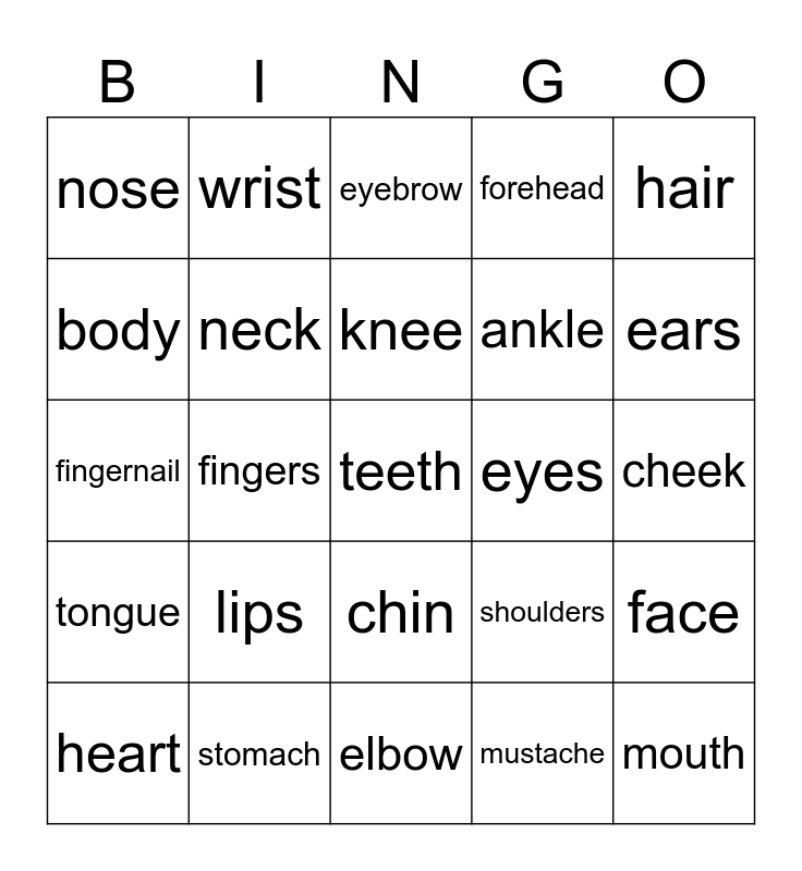 This bingo card has 36 words: arms, leg, chest, neck, shoulders, tongue, knee, head, hair, feet, fingers, forehead, hand, eyes, ears, nose, mouth, lips, teeth, eyebrow, cheek, face, stomach, heart, elbow, wrist, fingernail, eyelashes, ankle, body, hip, waist, mustache, chin, beard and toes.