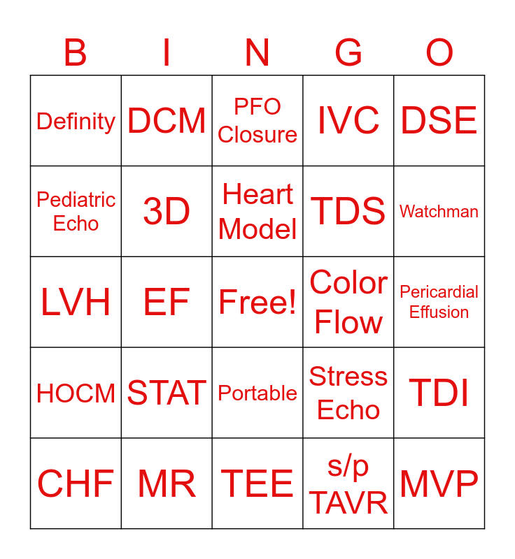 This bingo card has a free space and 29 words: CHF, A-Fib, EF, LAA, Definity, PFO Closure, 3D, STAT, Color Flow, MR, Pericardial Effusion, MVP, TEE, s/p TAVR, Watchman, 2D, Portable, HOCM, DSE, LVH, Stress Echo, AS, TDS, Pediatric Echo, IVC, DCM, TDI, Heart Model and Air Artifact.