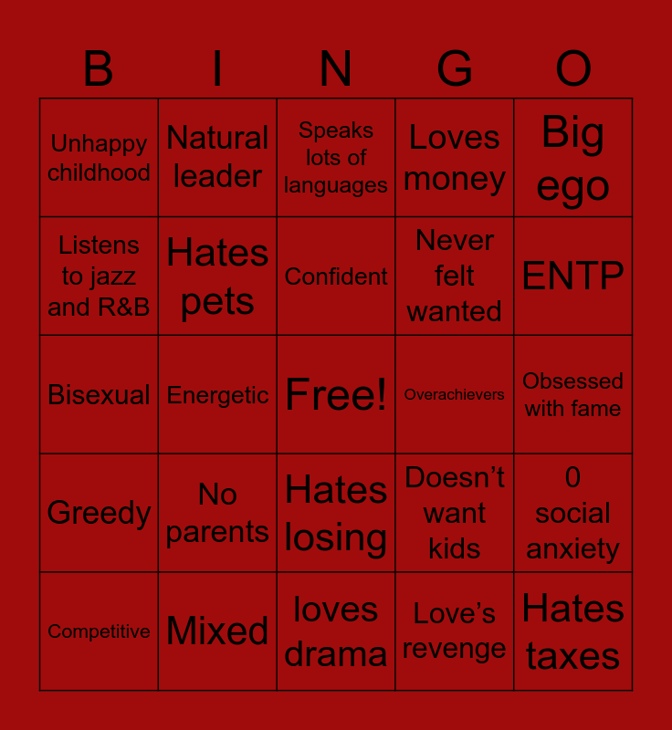 This bingo card has a free space and 24 words: No parents, Mixed, Confident, Competitive, Big ego, Unhappy childhood, Listens to jazz and R&B, Natural leader, Overachievers, Hates losing, Never felt wanted, Bisexual, Doesn’t want kids, 0 social anxiety, Hates pets, Love’s revenge, Obsessed with fame, Speaks lots of languages, ENTP, Energetic, Hates taxes, Greedy, Loves money and loves drama.