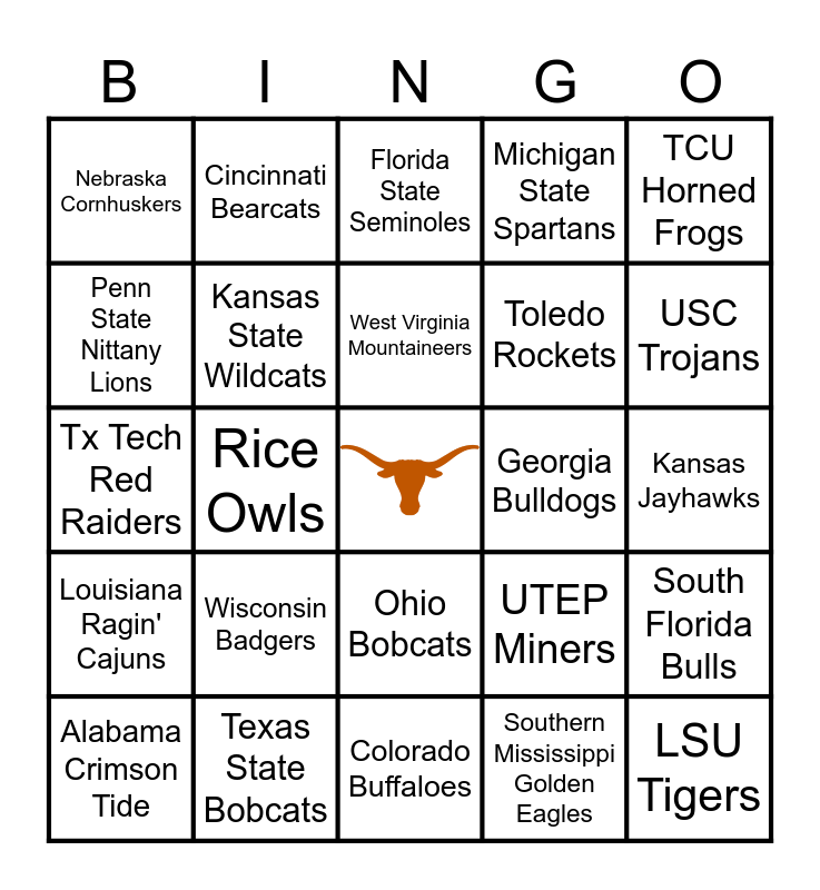 This bingo card has a free space and 79 words: Clemson Tigers, Duke Blue Devils, Florida State Seminoles, Georgia Tech Yellow Jackets, Louisville Cardinals, North Carolina Tar Heels, Virginia Tech Hokies, Pittsburgh Panthers, Miami Hurricanes, Indiana Hoosiers, Iowa Hawkeyes, Michigan Wolverines, Michigan State Spartans, Nebraska Cornhuskers, Ohio State Buckeyes, Penn State Nittany Lions, Purdue Boilermakers, Wisconsin Badgers, Baylor Bears, Kansas Jayhawks, Oklahoma Sooners, TCU Horned Frogs, Tx Tech Red Raiders, West Virginia Mountaineers, Kansas State Wildcats, Arizona State Sun Devils, California Golden Bears, Oregon Ducks, Oregon State Beavers, UCLA Bruins, USC Trojans, Washington Huskies, Colorado Buffaloes, Washington State Cougars, Alabama Crimson Tide, Georgia Bulldogs, Auburn Tigers, Florida Gators, Kentucky Wildcats, LSU Tigers, Ole Miss Rebels, South Carolina Gamecocks, Tennessee Volunteers, Texas A&M Aggies, Arkansas Razorbacks, Cincinnati Bearcats, Houston Cougars, SMU Mustangs, Temple Owls, Tulane Green Wave, South Florida Bulls, Rice Owls, UTEP Miners, UTSA Roadrunners, Old Dominion Monarchs, North Texas Mean Green, Ball State Cardinals, Buffalo Bulls, Kent State Golden Flashes, Ohio Bobcats, Toledo Rockets, Air Force Falcons, Colorado State Rams, Hawaii Rainbow Warriors, New Mexico Lobos, Wyoming Cowboys, Nevada Wolf Pack, Appalachian State Mountaineers, Georgia State Panthers, Louisiana Ragin' Cajuns, Texas State Bobcats, Troy Trojans, Notre Dame Fighting Irish, BYU Cougars, Stanford Cardinal, Southern Mississippi Golden Eagles, University of Memphis Tigers, UAB BLAZERS and Jackson State Tigers.
