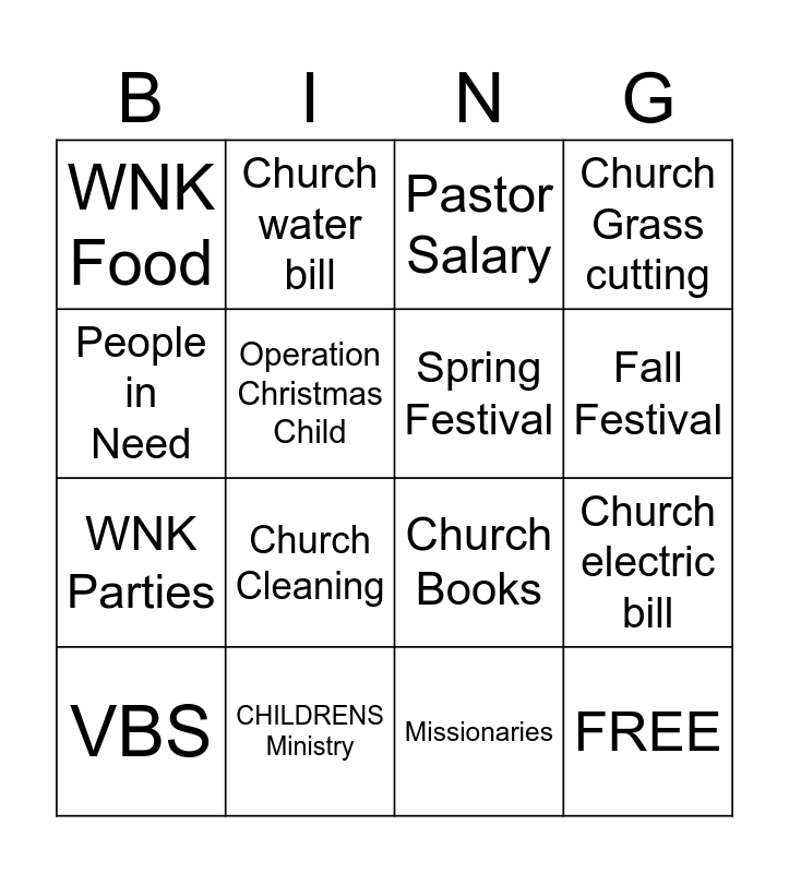 This bingo card has 16 words: CHILDRENS Ministry, Church electric bill, Pastor Salary, WNK Food, WNK Parties, Church water bill, Church Books, Missionaries, People in Need, Operation Christmas Child, VBS, Church Grass cutting, Church Cleaning, Fall Festival, Spring Festival and FREE.