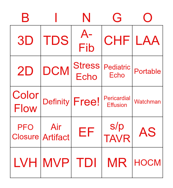 This bingo card has a free space and 29 words: LVH, STAT, Definity, DSE, 3D, A-Fib, DCM, Air Artifact, Pericardial Effusion, MVP, Watchman, HOCM, TDI, MR, Portable, IVC, EF, PFO Closure, LAA, Color Flow, s/p TAVR, Heart Model, Pediatric Echo, 2D, CHF, TDS, AS, Stress Echo and TEE.