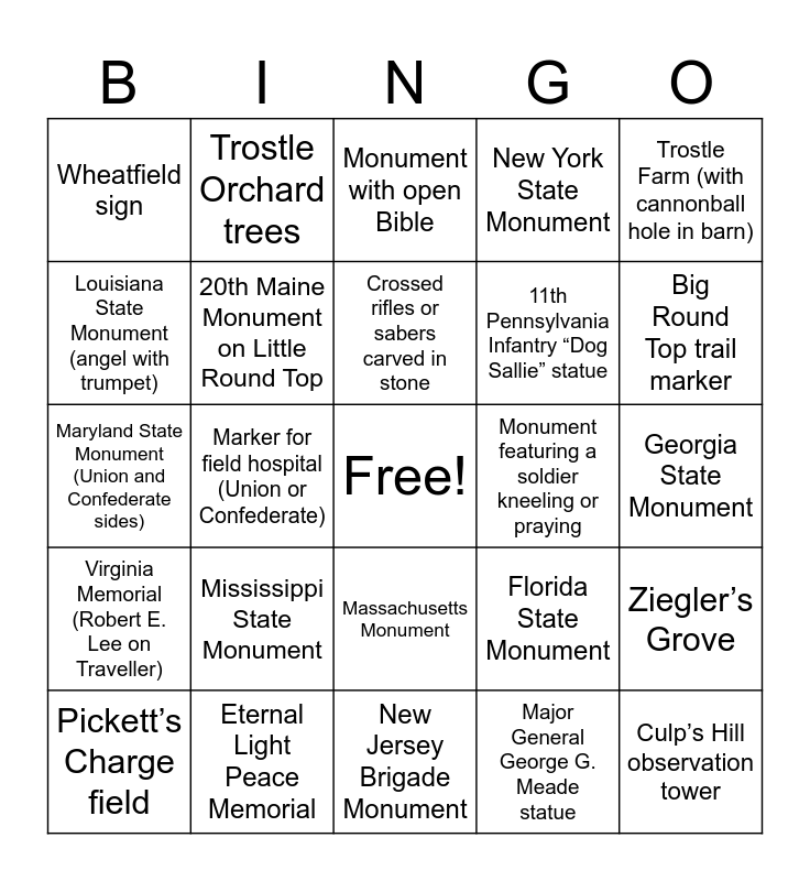 This bingo card has a free space and 60 words: Pennsylvania State Memorial, Eternal Light Peace Memorial, North Carolina State Monument, Virginia Memorial (Robert E. Lee on Traveller), Major General George G. Meade statue, 72nd Pennsylvania Infantry Monument, 20th Maine Monument on Little Round Top, Irish Brigade Monument (Clover symbol), 11th Pennsylvania Infantry “Dog Sallie” statue, High Water Mark of the Rebellion marker, New York State Monument, Minnesota State Monument, Louisiana State Monument (angel with trumpet), Cannon marked “U.S.” or “C.S.”, Cannonball pyramid, Wheatfield sign, Culp’s Hill observation tower, Trostle Farm (with cannonball hole in barn), 13 stars on a Union monument, Crossed rifles or sabers carved in stone, Monument featuring a soldier kneeling or praying, Monument with open Bible, Pickett’s Charge field, Ziegler’s Grove, Hands shaking in friendship, Monument with a drummer boy, Monument showing a soldier aiming a rifle, Plaque with casualty numbers, Big Round Top trail marker, Devil’s Den boulders, Spangler’s Spring, Codori Farm (along Emmitsburg Road), Copse of Trees (Pickett’s Charge target), Abraham Trostle House, Trostle Orchard trees, Headquarters marker for General Meade, Headquarters marker for General Lee, Marker for field hospital (Union or Confederate), Plaque describing “High Water Mark of the Rebellion”, Maryland State Monument (Union and Confederate sides), Alabama State Monument, Mississippi State Monument, Georgia State Monument, South Carolina State Monument, Florida State Monument, Tennessee State Monument, Texas State Monument, Arkansas State Monument, Vermont Brigade Monument, Massachusetts Monument, New Jersey Brigade Monument, Delaware State Monument, Maine State Monument, Michigan State Monument, Wisconsin State Monument, Ohio State Monument, Indiana State Monument, Illinois State Monument, Iowa State Monument and Kentucky State Monument.