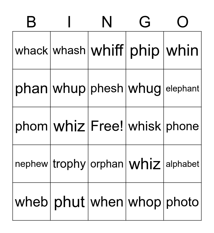 This bingo card has a free space and 31 words: when, whip, whiz, wham, whack, whiff, whup, whiz, whisk, whop, phone, photo, graph, phonics, elephant, dolphin, alphabet, trophy, nephew, orphan, whin, whot, wheb, whash, whug, phan, phip, phom, phut, phesh and phab.