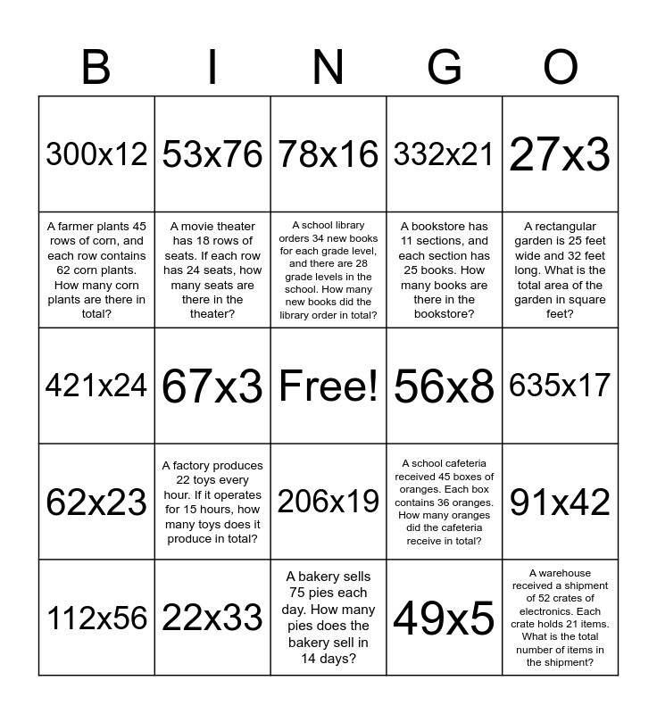 This bingo card has a free space and 24 words: A factory produces 22 toys every hour. If it operates for 15 hours, how many toys does it produce in total?, 22x33, A school library orders 34 new books for each grade level, and there are 28 grade levels in the school. How many new books did the library order in total?, 112x56, 27x3, 300x12, A farmer plants 45 rows of corn, and each row contains 62 corn plants. How many corn plants are there in total?, 53x76, 56x8, 206x19, A bookstore has 11 sections, and each section has 25 books. How many books are there in the bookstore?, 421x24, A school cafeteria received 45 boxes of oranges. Each box contains 36 oranges. How many oranges did the cafeteria receive in total?, 91x42, A movie theater has 18 rows of seats. If each row has 24 seats, how many seats are there in the theater?, 49x5, 635x17, 78x16, A rectangular garden is 25 feet wide and 32 feet long. What is the total area of the garden in square feet?, 67x3, A warehouse received a shipment of 52 crates of electronics. Each crate holds 21 items. What is the total number of items in the shipment?, 62x23, 332x21 and A bakery sells 75 pies each day. How many pies does the bakery sell in 14 days?.
