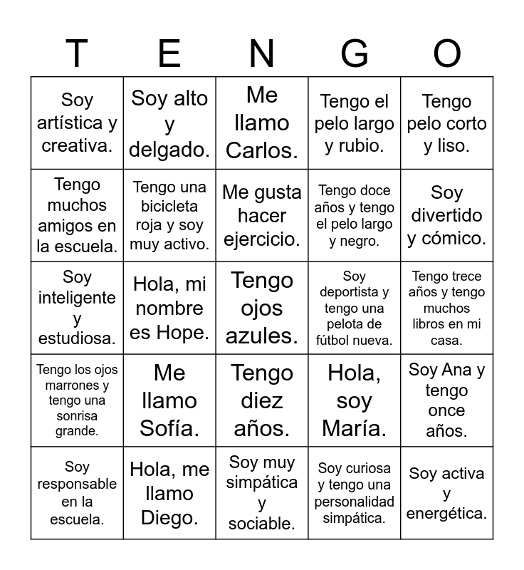 This bingo card has a free space and 27 words: Hola, soy María., Soy estudiante de sexto grado., Tengo doce años y tengo el pelo largo y negro., Soy muy simpática y sociable., Tengo muchos amigos en la escuela., Me llamo Carlos., Soy alto y delgado., Tengo los ojos marrones y tengo una sonrisa grande., Soy deportista y tengo una pelota de fútbol nueva., Soy Ana y tengo once años., Soy inteligente y estudiosa., Tengo el pelo largo y rubio., Soy responsable en la escuela., Hola, me llamo Diego., Soy divertido y cómico., Tengo el pelo castaño y corto., Tengo una bicicleta roja y soy muy activo., Me gusta hacer ejercicio., Me llamo Sofía., Soy artística y creativa., Tengo trece años y tengo muchos libros en mi casa., Soy curiosa y tengo una personalidad simpática., Hola, mi nombre es Hope., Soy activa y energética., Tengo diez años., Tengo pelo corto y liso. and Soy inteligente y curiosa y soy una persona alegre..