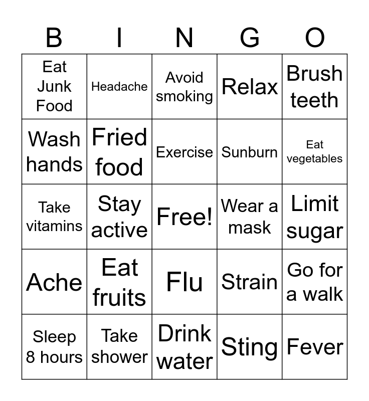 This bingo card has a free space and 25 words: Eat fruits, Drink water, Exercise, Sleep 8 hours, Brush teeth, Eat Junk Food, Wash hands, Headache, Wear a mask, Flu, Sunburn, Take vitamins, Strain, Go for a walk, Fried food, Eat breakfast, Limit sugar, Avoid smoking, Eat vegetables, Stay active, Fever, Take shower, Ache, Relax and Sting.