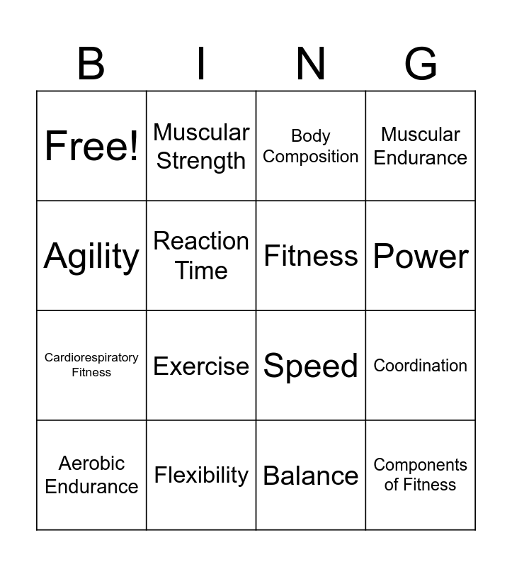 This bingo card has 16 words: Aerobic Endurance, Flexibility, Body Composition, Muscular Endurance, Agility, Muscular Strength, Speed, Coordination, Free!, Reaction Time, Balance, Power, Cardiorespiratory Fitness, Exercise, Fitness and Components of Fitness.