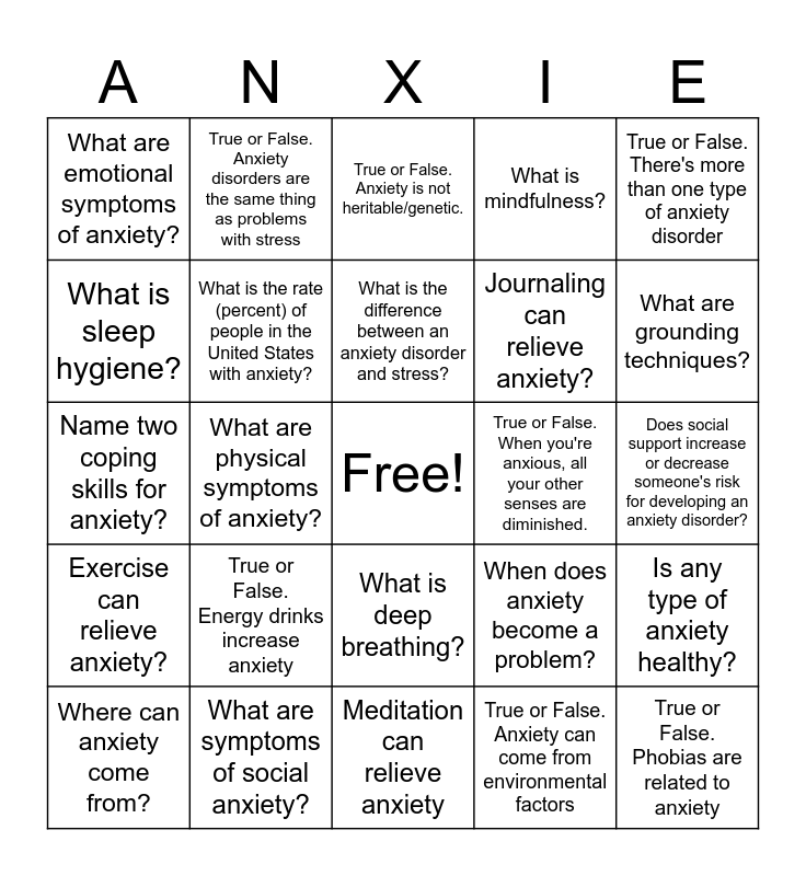 This bingo card has a free space and 24 words: Where can anxiety come from?, True or False. Energy drinks increase anxiety, What is the difference between an anxiety disorder and stress?, True or False. Anxiety can come from environmental factors, True or False. There's more than one type of anxiety disorder, What are emotional symptoms of anxiety?, True or False. Anxiety disorders are the same thing as problems with stress, True or False. Anxiety is not heritable/genetic., True or False. When you're anxious, all your other senses are diminished., Does social support increase or decrease someone's risk for developing an anxiety disorder?, Name two coping skills for anxiety?, What is the rate (percent) of people in the United States with anxiety?, When does anxiety become a problem?, Is any type of anxiety healthy?, What is sleep hygiene?, What are symptoms of social anxiety?, Meditation can relieve anxiety, What is mindfulness?, What are grounding techniques?, Exercise can relieve anxiety?, What are physical symptoms of anxiety?, What is deep breathing?, Journaling can relieve anxiety? and True or False. Phobias are related to anxiety.