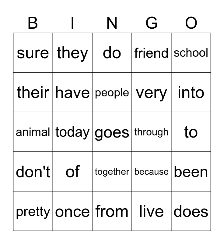 This bingo card has a free space and 24 words: of, once, people, pretty, school, sure, their, they, through, together, very, animal, because, been, have, live, to, do, into, today, does, don't, friend and from.