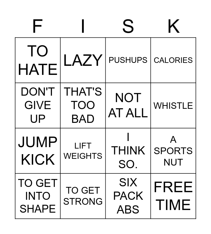 This bingo card has 32 words: BINGO!, A FITNESS FREAK, A SPORTS NUT, A COUCH POTATO, FREE TIME, NOT AT ALL, DON'T GIVE UP, LIE DOWN, LAZY, CYCLING, WHISTLE, PUSHUPS, WHAT'S GOING ON?, FULL SPLIT, TO GET STRONG, GYM, SWIMMING, I THINK SO., REALLY?, YOU'RE WELCOME, AD, HAVE A NICE DAY, SIX PACK ABS, AEROBICS, TO GET INTO SHAPE, CALORIES, JUMP KICK, THAT'S TOO BAD, TO HATE, PLAY SOCCER, GO SURFING and LIFT WEIGHTS.