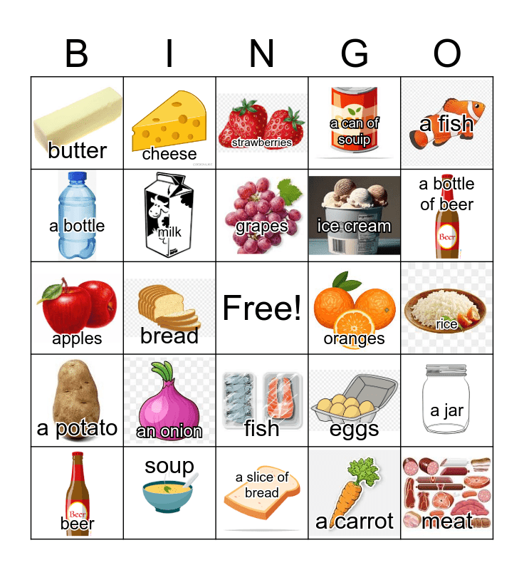 This bingo card has 24 images, a free space and 24 words: an onion, soup, grapes, beer, a fish, butter, a bottle, cheese, oranges, fish, ice cream, apples, eggs, a jar, milk, a carrot, rice, strawberries, a bottle of beer, bread, meat, a potato, a can of souip and a slice of bread.