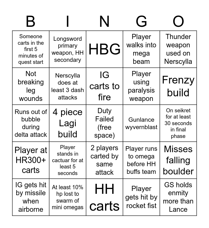 This bingo card has a free space and 55 words: Player with shield not taking enmity, IG gets hit by missile when airborne, Only one person using lifepowder, Someone carts in the first 5 minutes of quest start, HH carts, Someone carts to Nerscylla, Nerscylla does at least 3 dash attacks, At least 3 mustard pools on the ground at one time, Player using paralysis weapon, Player with guts build gets one shot in phase 1/2, Player walks into mega beam, Player gets paralyzed by morbul, Mount within 2 minutes of quest start, Seikret combat, DB carts 2+ times, Nobody has a shield weapon, Thunder weapon used on Nerscylla, 4 piece Lagi build, 2 SnS in one quest, GS holds enmity more than Lance, Gunlance wyvernblast, Someone misses a Mog of the Ages, Player runs to omega before HH buffs team, HBG, Lance carts, IG carts to fire, Player gets hit by rocket fist, Drops mustard on top of another player, On seikret for at least 30 seconds in final phase, Misses falling boulder, Player gets carted while frostbitten, Nerscylla depawns while bleeding skulls, Charge Blade takes enmity, Insta-breaking head wound, Not breaking leg wounds, Runs out of bubble during delta attack, Power clash, Player at HR300+ carts, Communication error, Switch Axe, Longsword primary weapon, HH secondary, At least 2 HP penalties, Player not targeted by Omega gets hit by beam, Player collision during MRV, Player stands in cactuar for at least 5 seconds, At least 10% hp lost to swarm of mini omegas, Mini shield omega kills itself, Someone carts to Tantrum attack, Bale armor + GS, Frenzy build, DPS takes enmity from tank, Bow carts trying to ego dodge beam, 2/3 faints entering final phase, 2 players carted by same attack and Player drops mustard on damaged shield.