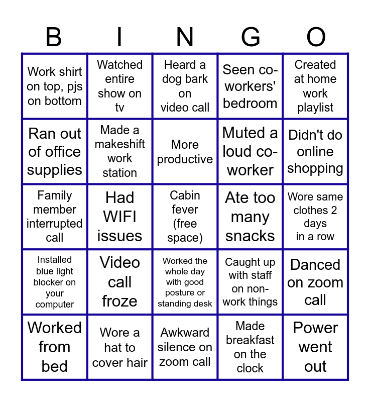 This bingo card has a free space and 29 words: Worked from bed, Got distracted by social media, Had WIFI issues, Slept through your alarm, Work shirt on top, pjs on bottom, Heard a dog bark on video call, Made a makeshift work station, Video call froze, Ate too many snacks, Wore a hat to cover hair, Wore same clothes 2 days in a row, Power went out, Awkward silence on zoom call, Made breakfast on the clock, Didn't do online shopping, Stood up at least once an hour, Worked the whole day with good posture or standing desk, Installed blue light blocker on your computer, Created at home work playlist, Family member interrupted call, Caught up with staff on non-work things, Customized a virtual background, Muted a loud co-worker, Ran out of office supplies, Seen co-workers' bedroom, Watched entire show on tv, Danced on zoom call, More productive and Tidy up home.