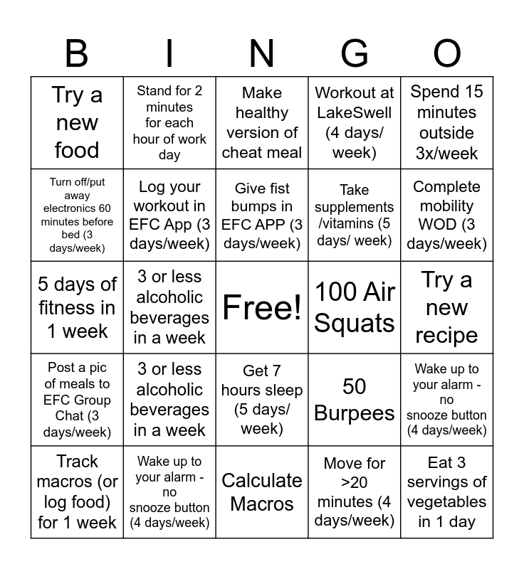 This bingo card has a free space and 34 words: Reach Protein Goal (3 days/week), Move for >20 minutes (4 days/week), Establish an accountability Buddy/Group, Eat 3 servings of fruits & veggies for a day, Post a pic of meals to EFC Group Chat (3 days/week), Log your workout in EFC App (3 days/week), Spend 15 minutes outside 3x/week, Track macros (or log food) for 1 week, Stand for 2 minutes for each hour of work day, 10 minutes of morning meditation or breathing, Give fist bumps in EFC APP (3 days/week), Make healthy version of cheat meal, Turn off/put away electronics 60 minutes before bed (3 days/week), Drink 64+ oz of water (5 days/week), 100 Air Squats, Complete mobility WOD (3 days/week), Wake up to your alarm - no snooze button (4 days/week), 5 days of fitness in 1 week, 3 or less alcoholic beverages in a week, 50 Burpees, Get 7 hours sleep (5 days/ week), Go sweets free for a day, Try a new food, Try a new recipe, Calculate Macros, Eat 3 servings of vegetables in 1 day, Workout at LakeSwell (4 days/ week), Eat foods with no added sugar (2 days/week), Take supplements /vitamins (5 days/ week), Turn off/put away electronics 60 minutes before bed (3 days/week), Journal for 5-10 minutes (4 days/week), 3 or less alcoholic beverages in a week, Wake up to your alarm - no snooze button (4 days/week) and Do 10 minutes of core or skill work post-WOD (2 days/week).