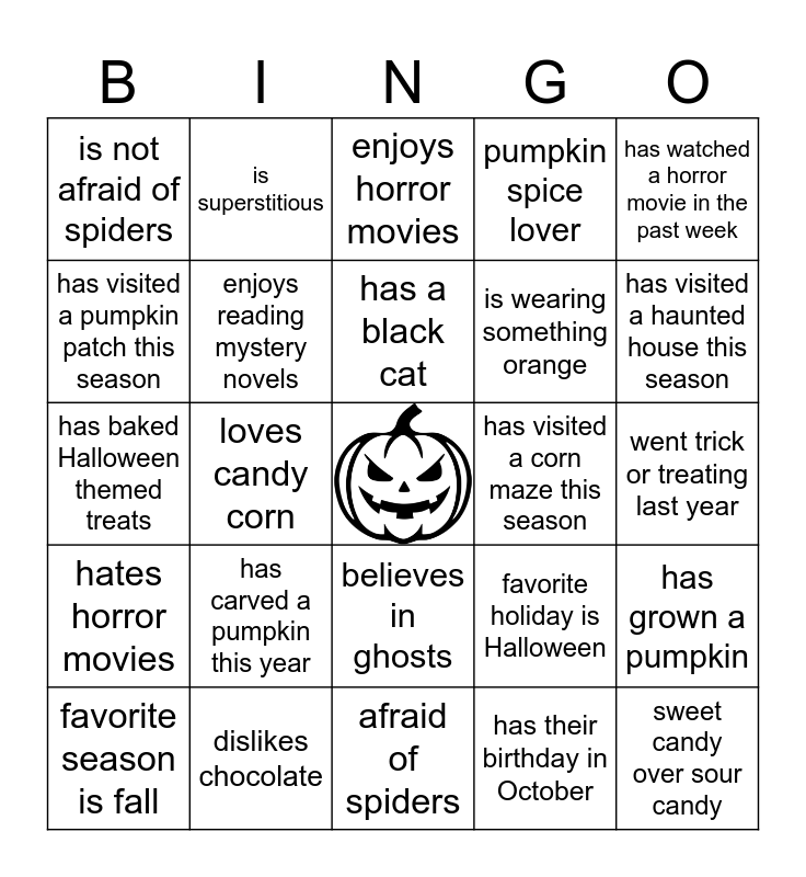 This bingo card has a free space and 24 words: has carved a pumpkin this year, dislikes chocolate, has a black cat, favorite season is fall, has watched a horror movie in the past week, is not afraid of spiders, has visited a pumpkin patch this season, is superstitious, has visited a corn maze this season, believes in ghosts, is wearing something orange, has baked Halloween themed treats, favorite holiday is Halloween, has grown a pumpkin, enjoys reading mystery novels, has their birthday in October, went trick or treating last year, enjoys horror movies, has visited a haunted house this season, loves candy corn, sweet candy over sour candy, hates horror movies, pumpkin spice lover and afraid of spiders.