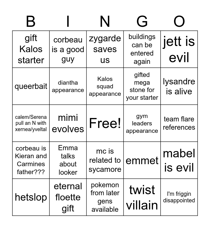 This bingo card has a free space and 24 words: Emma talks about looker, eternal floette gift, Kalos squad appearance, hetslop, jett is evil, gift Kalos starter, queerbait, corbeau is a good guy, gym leaders appearance, mc is related to sycamore, gifted mega stone for your starter, calem/Serena pull an N with xernea/yveltal, emmet, mabel is evil, diantha appearance, twist villain, team flare references, zygarde saves us, lysandre is alive, mimi evolves, I'm friggin disappointed, corbeau is Kieran and Carmines father???, buildings can be entered again and pokemon from later gens available.