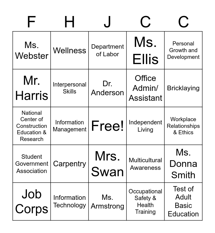 This bingo card has a free space and 29 words: Job Corps, Communitcation, Information Management, Welding, Ms. Webster, Department of Labor, Interpersonal Skills, Carpentry, Independent Living, Information Technology, Workplace Relationships & Ethics, Test of Adult Basic Education, Ms. Armstrong, Occupational Safety & Health Training, Bricklaying, Culinary Arts, Mrs. Swan, Student Government Association, Personal Growth and Development, National Center of Construction Education & Research, Multicultural Awareness, Career and Personal Planning, Office Admin/ Assistant, Mr. Harris, Ms. Ellis, Wellness, Ms. Donna Smith, Dr. Anderson and Mr. Norwood.