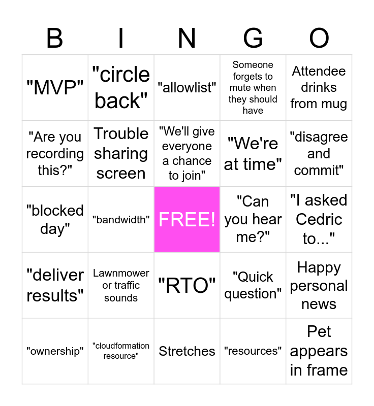 This bingo card has a free space and 49 words: "Can everybody see my screen?", Pet appears in frame, Someone's mic isn't working, Stretches, Lawnmower or traffic sounds, Household member seen, "circle back", Host arrives late, "Are you recording this?", Someone leaves early, Trouble sharing screen, Someone forgets to mute when they should have, Happy personal news, "Quick question", "Can you believe it's already {month}?", "Sorry I was on mute", "We'll give everyone a chance to join", "Can you hear me?", "pre:invent", Attendee drinks from mug, "bandwidth", "resources", "MVP", "We're at time", "NTD", "disagree and commit", "ownership", "customer obsessed", "RTO", "deliver results", "earn trust", "re:invent", "wiki", "Taskei", "cloudformation resource", "diffdoc", "README", "I used Q to...", "I asked Cedric to...", "mainline", "Launch Manager", "content strategy", "Fusion", "merge conflict", "blocked day", "allowlist", "NPP", "feedback tickets" and "sev2".