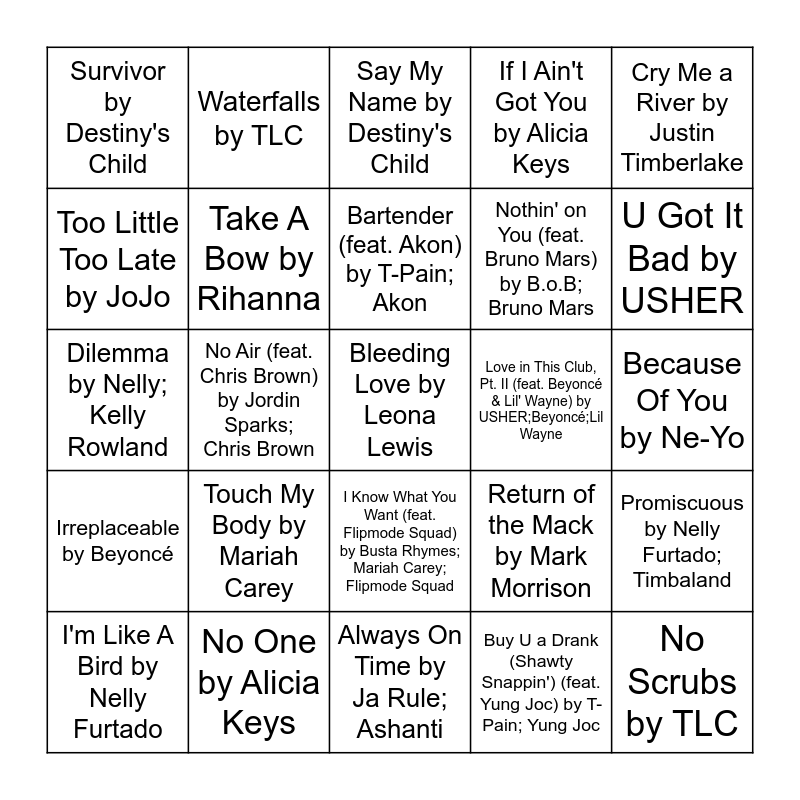 This bingo card has 41 words: Family Affair by Mary J. Blige, Dilemma by Nelly; Kelly Rowland, Crazy In Love (feat. JAY-Z) by Beyoncé; JAY-Z, Take A Bow by Rihanna, No One by Alicia Keys, I Know What You Want (feat. Flipmode Squad) by Busta Rhymes; Mariah Carey; Flipmode Squad, Bartender (feat. Akon) by T-Pain; Akon, Miss Independent by Ne-Yo, Cry Me a River by Justin Timberlake, Irreplaceable by Beyoncé, No Air (feat. Chris Brown) by Jordin Sparks; Chris Brown, If I Ain't Got You by Alicia Keys, Bleeding Love by Leona Lewis, Because Of You by Ne-Yo, Love in This Club, Pt. II (feat. Beyoncé & Lil' Wayne) by USHER;Beyoncé;Lil Wayne, Touch My Body by Mariah Carey, Hate That I Love You by Rihanna; Ne-Yo, Survivor by Destiny's Child, Lost Without U by Robin Thicke, Say My Name by Destiny's Child, Promiscuous by Nelly Furtado; Timbaland, No Scrubs by TLC, Always On Time by Ja Rule; Ashanti, Nothin' on You (feat. Bruno Mars) by B.o.B; Bruno Mars, Beautiful Girls by Sean Kingston, The Boy Is Mine by Brandy; Monica, Buy U a Drank (Shawty Snappin') (feat. Yung Joc) by T-Pain; Yung Joc, Live Your Life by T.I.; Rihanna, U Got It Bad by USHER, Drunk in Love (feat. JAY-Z) by Beyoncé; JAY-Z, No Diggity by Blackstreet; Dr. Dre; Queen Pen, Waterfalls by TLC, I'm Like A Bird by Nelly Furtado, Love by Keyshia Cole, Return of the Mack by Mark Morrison, Too Little Too Late by JoJo, End Of The Road by Boyz II Men, Who's That Girl? by Eve, Leave (Get Out) by JoJo, Redbone by Childish Gambino and Empire State of Mind (Part II) Broken Down by Alicia Keys.