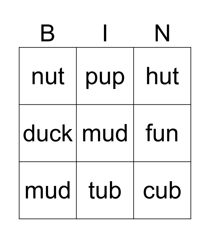 This bingo card has a free space and 16 words: rug, bug, hut, nut, cup, pup, gum, hum, cub, fun, sun, duck, luck, tub, mud and spud.
