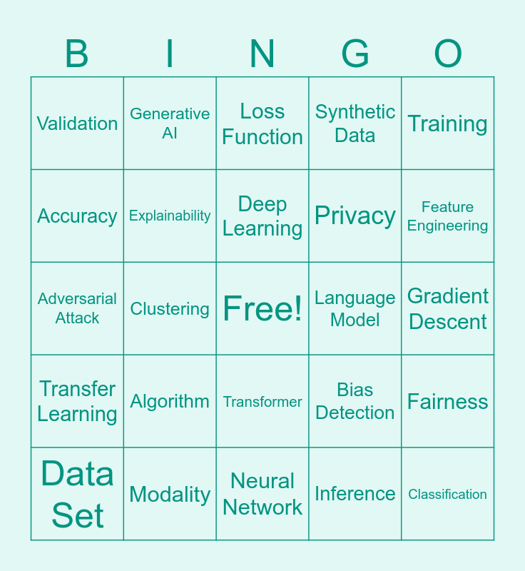 This bingo card has a free space and 25 words: Algorithm, Neural Network, Deep Learning, Data Set, Training, Validation, Accuracy, Generative AI, Language Model, Transformer, Privacy, Adversarial Attack, Bias Detection, Fairness, Explainability, Optimization, Gradient Descent, Loss Function, Feature Engineering, Clustering, Classification, Modality, Transfer Learning, Synthetic Data and Inference.