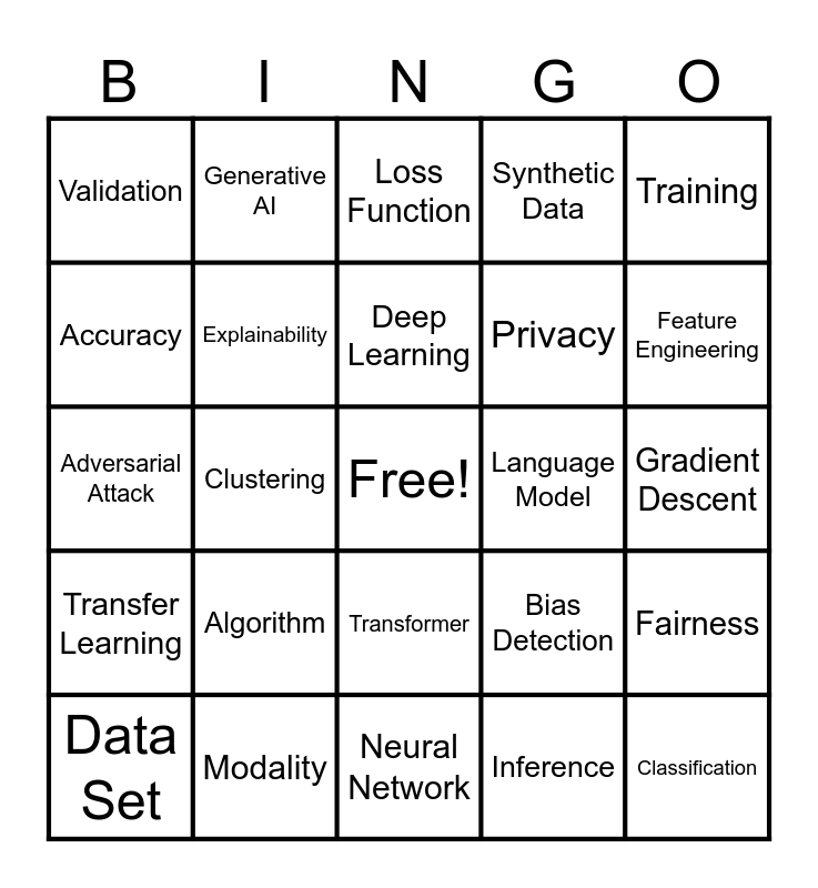 This bingo card has a free space and 25 words: Algorithm, Neural Network, Deep Learning, Data Set, Training, Validation, Accuracy, Generative AI, Language Model, Transformer, Privacy, Adversarial Attack, Bias Detection, Fairness, Explainability, Optimization, Gradient Descent, Loss Function, Feature Engineering, Clustering, Classification, Modality, Transfer Learning, Synthetic Data and Inference.