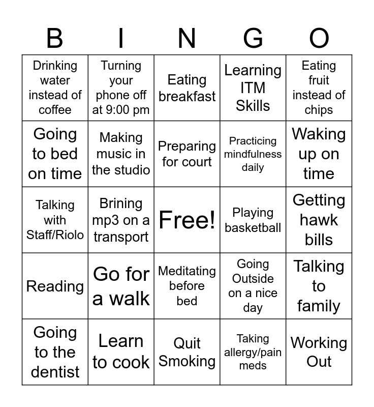 This bingo card has a free space and 24 words: Go for a walk, Learn to cook, Preparing for court, Going to the dentist, Eating fruit instead of chips, Drinking water instead of coffee, Going to bed on time, Turning your phone off at 9:00 pm, Playing basketball, Meditating before bed, Practicing mindfulness daily, Talking with Staff/Riolo, Going Outside on a nice day, Talking to family, Making music in the studio, Taking allergy/pain meds, Getting hawk bills, Eating breakfast, Waking up on time, Brining mp3 on a transport, Working Out, Reading, Learning ITM Skills and Quit Smoking.