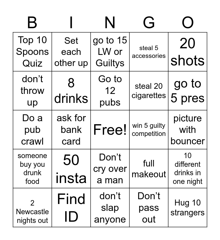 This bingo card has a free space and 24 words: 50 insta, Find ID, Go to 12 pubs, 2 Newcastle nights out, 20 shots, Top 10 Spoons Quiz, don’t throw up, Set each other up, win 5 guilty competition, Don’t cry over a man, steal 20 cigarettes, Do a pub crawl, full makeout, 10 different drinks in one night, 8 drinks, Don’t pass out, picture with bouncer, go to 15 LW or Guiltys, go to 5 pres, ask for bank card, Hug 10 strangers, someone buy you drunk food, steal 5 accessories and don’t slap anyone.
