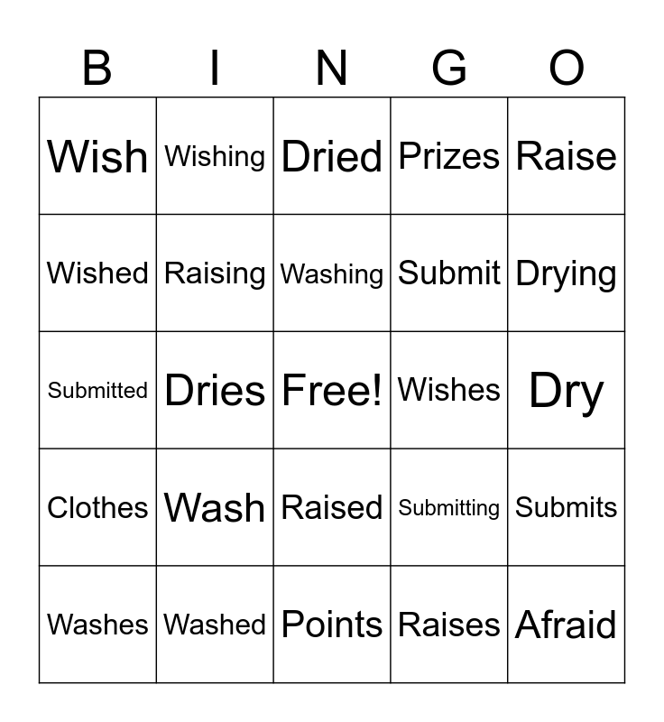 This bingo card has a free space and 24 words: Wash, Washed, Washing, Washes, Raise, Wish, Wished, Wishing, Wishes, Raised, Submit, Submitted, Submitting, Submits, Raising, Raises, Dry, Dried, Drying, Dries, Afraid, Clothes, Prizes and Points.