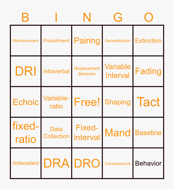 This bingo card has a free space and 24 words: Antecedent, Data Collection, Replacement Behavior, Consequence, Extinction, Reinforcement, Punishment, Pairing, Shaping, Tact, Echoic, Intraverbal, Mand, Baseline, DRI, DRA, DRO, Generalization, Fading, fixed-ratio, Variable-ratio, Fixed-interval, Variable Interval and Behavior.