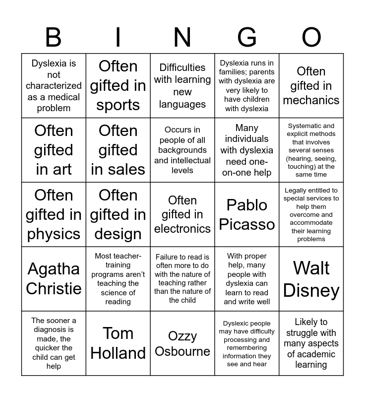 This bingo card has 77 words: Free!, Language-based learning disability, Difficulties with learning new languages, Typos, Affects individuals throughout their lives, Causes of dyslexia are still not completely clear, Slow or inaccurate reading, Poor spelling, Poor writing, Mixing up similar words, Likely to struggle with many aspects of academic learning, Likely to benefit from systematic, explicit, instruction in reading, writing, and language, Occurs in people of all backgrounds and intellectual levels, Often gifted in art, Often gifted in computer science, Often gifted in design, Often gifted in drama, Often gifted in electronics, Often gifted in math, Often gifted in mechanics, Often gifted in music, Often gifted in physics, Often gifted in sales, Often gifted in sports, Dyslexia runs in families; parents with dyslexia are very likely to have children with dyslexia, The impact that dyslexia has is different for each person, The core difficulty is with word recognition and reading fluency, spelling, and writing, Can have problems with spoken language, May find it difficult to express themselves clearly, May find it difficult to fully comprehend what others mean when they speak, Dyslexia can affect a person’s self-image, Students with dyslexia often end up feeling “dumb” and less capable than they actually are, Not all students who have difficulties with these skills have dyslexia, With proper help, many people with dyslexia can learn to read and write well, Systematic and explicit methods that involves several senses (hearing, seeing, touching) at the same time, Many individuals with dyslexia need one-on-one help, It is helpful if outside academic therapists work closely with classroom teachers, Schools can implement academic accommodations and modifications, Legally entitled to special services to help them overcome and accommodate their learning problems, Dyslexic people may have difficulty processing and remembering information they see and hear, Across all languages, Various degrees of severity, Dyslexia frequently co-occurs with one or more other developmental difficulties, Dyslexia and intelligence are NOT connected, Dyslexia is one of the most common causes of reading difficulties in elementary school children, We can accurately identify those who are at-risk for dyslexia as early as preschool, The sooner a diagnosis is made, the quicker the child can get help, Dyslexia is not characterized as a medical problem, There is no pill or medication that can heal dyslexia, Dyslexia is typically not covered by medical insurance, Difficulty with phonics and word pronunciation is a good warning sign of dyslexia in children, Failure to read is often more to do with the nature of teaching rather than the nature of the child, A child will not develop dyslexia because they have trouble reading, It is never too late to improve the reading, spelling, and writing skills, Dyslexia does not affect eyesight, There is absolutely no relation between dyslexia and IQ, Most classroom teachers have not had formal training in dyslexia, Some people may try to deny the existence of dyslexia, Unfortunately, even children with mild dyslexia can easily fall behind in school, Most classroom accommodations don’t cost anything, nor do they require any special teacher training, Most teacher-training programs aren’t teaching the science of reading, Steven Spielberg, Jamie Oliver, Albert Einstein, Tom Cruise, Leonardo da Vinci, Jennifer Aniston, Pablo Picasso, John Lennon, Lewis Hamilton, Steve Jobs, Walt Disney, Agatha Christie, Tom Holland, Tommy Hilfiger, Ozzy Osbourne and Victoria, Crown Princess of Sweden.