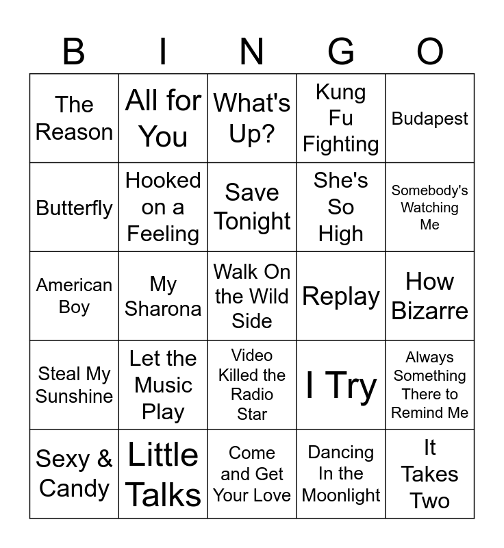 This bingo card has 35 words: How Long, Barbie Girl, Just the Two of Us, Hooked on a Feeling, Video Killed the Radio Star, Kung Fu Fighting, Butterfly, Whip It, Save Tonight, Love Grows (Where My Rosemary Goes), American Boy, Budapest, Tongue Tied, MMMBop, The Reason, Replay, Dancing In the Moonlight, My Sharona, Steal My Sunshine, Walk On the Wild Side, I Try, Sexy & Candy, Always Something There to Remind Me, Little Talks, What's Up?, Somebody's Watching Me, It Takes Two, Hey Mickey, She's So High, How Bizarre, I'm Gonna Be (500 Miles), Come and Get Your Love, Let the Music Play, All for You and Two Princes.