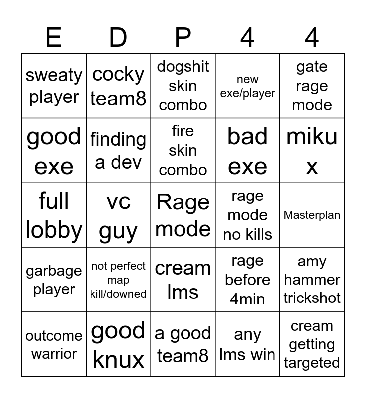 This bingo card has a free space and 26 words: cream lms, any lms win, fire skin combo, good knux, gate rage mode, sweaty player, good exe, cocky team8, Masterplan, rage before 4min, bad exe, full lobby, amy hammer trickshot, outcome warrior, vc guy, tails missing stun, new exe/player, garbage player, dogshit skin combo, cream getting targeted, miku x, a good team8, rage mode no kills, not perfect map kill/downed, finding a dev and Fail.