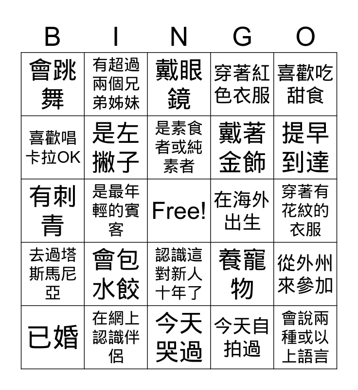 This bingo card has a free space and 24 words: 會包水餃, 在網上認識伴侶, 是素食者或純素者, 已婚, 喜歡吃甜食, 會跳舞, 喜歡唱卡拉OK, 有超過兩個兄弟姊妹, 在海外出生, 認識這對新人十年了, 戴著金飾, 有刺青, 養寵物, 從外州來參加, 是左撇子, 今天自拍過, 穿著有花紋的衣服, 戴眼鏡, 提早到達, 是最年輕的賓客, 會說兩種或以上語言, 去過塔斯馬尼亞, 穿著紅色衣服 and 今天哭過.