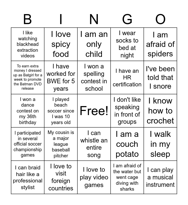This bingo card has a free space and 29 words: I can braid hair like a professional stylist, I love snakes, I played beach soccer since I was 10 years old, I can't swim, I like watching blackhead extraction videos, I am an only child, I have worked for BWE for 5 years, My cousin is a major league baseball pitcher, I don't like speaking in front of groups, I love to visit foreign countries, I know how to crochet, I can play a musical instrument, I love to play video games, I am afraid of the water but went cage diving with sharks, I've been told that I snore, I have worked in another BWE department, I can whistle an entire song, I participated in several official soccer championship games, I am afraid of spiders, I won a dance contest on my 36th birthday, I am a couch potato, I pickup local accents & expressions wherever I am, I have an HR certification, To earn extra money I dressed up as Batgirl for a week to promote the Batman DVD release, I wear socks to bed at night, I love spicy food, I walk in my sleep, I won a spelling contest in school and I am afraid on flying on an airplane.