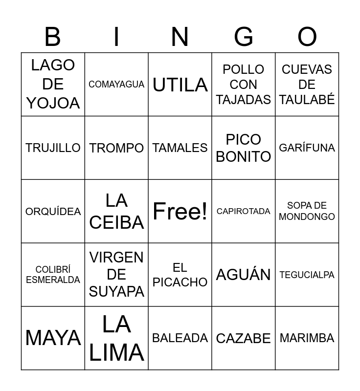 This bingo card has a free space and 79 words: LEMPIRA, GUANAJA, UTILA, ROATÁN, CIPOTES, MORAZÁN, RÍO PATUCA, PASTELITOS, SOPA DE CARACOL, LA MOSQUITIA, ESCUDO, 15 DE SEPTIEMBRE, POLLO CON TAJADAS, LAGO DE YOJOA, OLANCHO, TRUJILLO, ATOL DE ELOTE, VIRGEN DE SUYAPA, PAN DE COCO, SOPA DE MONDONGO, EL PINO, CUEVAS DE TAULABÉ, ORQUÍDEA, TAMALES, TROMPO, GUACAMAYA, YUCA CON CHICHARRÓN, RUINAS DE COPÁN, OMOA, PULHAPANZAK, GARÍFUNA, LENCA, BALEADA, TAWAHKA, MAYA, CAPIROTADA, TIBURÓN BALLENA, SOPA DE CARACOL, CHIMOL, MARIMBA, ALCITRONES, SEMITAS, TONCONTÍN, RÍO PLÁTANO, LANCETILLA, COMAYAGUA, OCOTEPEQUE, LA PAZ, TROPICAL, VALLE DE ÁNGELES, TEGUCIALPA, LA CEIBA, AGUÁN, CATRACHOS, CHIQUITA BANANA, SAN PEDRO SULA, PUERTO CORTÉS, CHOLUTECA, INTIBUCÁ, EL PICACHO, PICO BONITO, EL PARAÍSO, INDEPENDENCIA, DANZAS FOLKÓRICAS, PUNTA, PECH, NEGRO INGLÉS, CAFÉ ORO, 5 ESTRELLAS, COLIBRÍ ESMERALDA, LA LIMA, PAN DE COCO, TAPADO OLANCHANO, CENTRO AMÉRICA, LA ESPERANZA, CAZABE, RAPADURA, LA ESPERANZA and COCO DE AGUA.