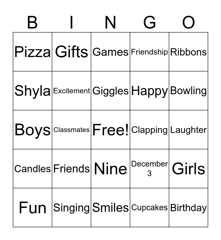This bingo card has a free space and 24 words: Friends, Singing, Giggles, Fun, Ribbons, Pizza, Shyla, Gifts, Clapping, Nine, Happy, Boys, December 3, Girls, Excitement, Cupcakes, Laughter, Games, Bowling, Classmates, Birthday, Candles, Friendship and Smiles.