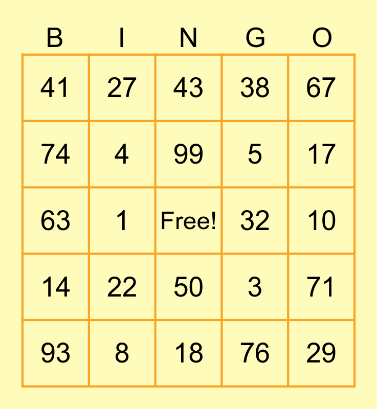 This bingo card has a free space and 24 words: 22, 8, 99, 93, 67, 41, 74, 27, 32, 50, 5, 63, 3, 71, 4, 76, 10, 43, 17, 1, 29, 14, 38 and 18.